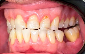 Foto 1 – Durante a profilaxia notamos que as duas restaurações estão com infiltrações nas margens e trincas e manchas dentro da resina.